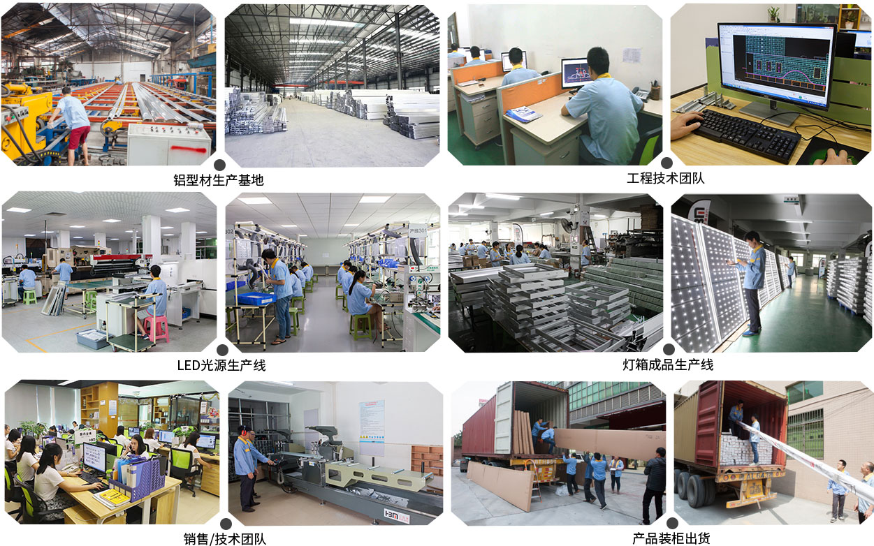 匯百美15年,有3000㎡的鋁材生產基地,LED光源生產線以及拉布燈箱成品生產線